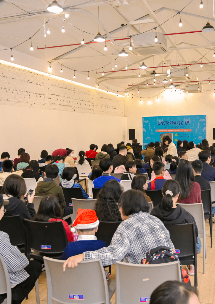 Ảnh Lily chụp cùng nhà hoạt động xã hội Nguyễn Quang Thạch, nhà nghiên cứu giáo dục Nguyễn Quốc Vương, nhà văn Hà Thủy Nguyên, và ba của Lily là tiến sĩ Hồ Hồng Hải, trong buổi ra mắt cuốn sách “Không Thể Dừng Bước”